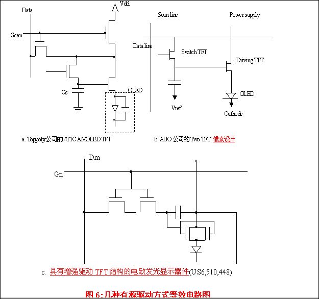 而LTPS所提供的TFT主动矩阵驱动以及驱动电路和TFT可同时整合制造,恰可维持轻薄化优势情形下并解决上述分辨率的问题。LTPS俨然变成横跨小尺寸LCD和OLED的共同必要技术,可以使2.5寸的面板具备200ppi的高分辨率。所以OLED的发展需要低温多晶硅强化其驱动电路[8]。 图 6为几种有源矩阵驱动方式的TFT结构图。